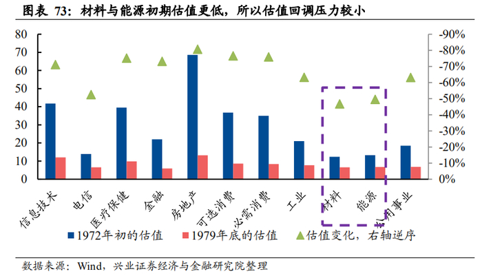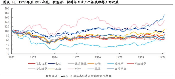 估值方面,由于能源与材料板块的PE在70年代初期排名靠后,叠加滞胀时期业绩确定性更强、更吸引投资者,所以能源与材料行业在70年代所遭受的“杀估值”幅度更小,分别为47%和50%,在所有行业中排名靠后。