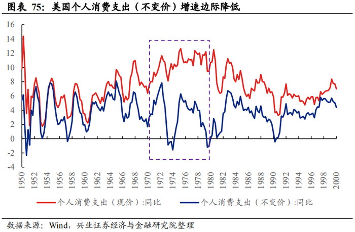 (2)居民消费边际降低:受消费意愿和能力降低的拖累,美国居民消费支出减少。一方面,尽管高通胀时期理应加大消费支出以减少货币贬值所带来的负面作用,但70年代除了“胀“还有“滞“,对于经济的不乐观预期削弱了人们的消费意愿,该时期,密歇根大学消费信心指数由80下行至61;另一方面,累进制税率下,通货膨胀降低了居民的实际收入,70年代美国居民人均可支配收入(不变价)累计增长23.5%,较60年代的37.5%大幅放缓。此外,通胀引发的高利率也不利于消费的增长,以可选消费中的汽车为例,该阶段商业银行的48个月新车贷款利率由10%升至16%左右,试想有多少人会以如此高的利率购买汽车呢?
