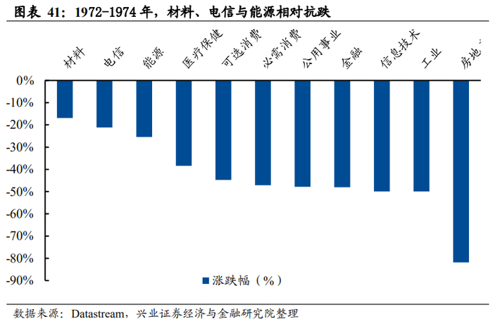 阶段3:1973-1974年,通货膨胀程度加剧,美股快速走熊,道指与标普500跌幅在40%左右;材料、电信与能源行业相对抗跌,房地产与工业板块表现靠后。