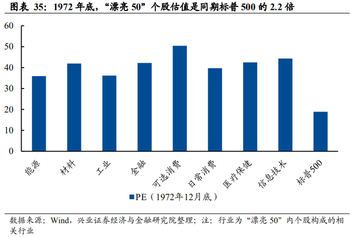 讽刺的是,后期,市场投资大盘蓝筹股的逻辑由理性逐渐转变为盲目,资金的无脑涌入助涨“漂亮50”估值飙升。彼时的投资者对“漂亮50”产生“过度投资”,他们认为这些公司业绩如此之好,付出任何代价都无所谓,股价的一路飙升总会让你获得巨大的收益,于是资金持续涌入“漂亮50”个股。截至1972年年底,美国“漂亮50”平均PE达到了41.5倍,而同期标普500的PE仅19倍出头,美国“漂亮50”平均PE是标普500的2.2倍。