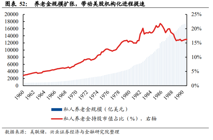 (2)1974年美国政府颁布实施了《雇员退休收入保障法》(ERISA),将原来企业养老保险“现收现付制”改为独立于企业雇主资产的“基金制”,同时为了降低企业雇员养老金损失的风险,美国政府要求企业雇主向联邦政府成立的养老金担保公司(PBGC)缴纳保险费,另外,该法案还历史性地提出了个人养老金账户(IRA)的概念。1978年,美国国内税收法第401条新增第(K)项,该条款给予了雇主和雇员双方税收优惠,激发了两方建立和参与雇主养老金计划的积极性。IRA计划和401(K)计划的出现加速了美国养老金规模扩张,有利于美股机构化进程提速。截至1978年底,私人养老金规模上涨超50%至4130亿美元,其持有的美股市值占比增长3.7pct至15.5%。养老金这类偏好价值投资的长钱入市有利于与股市上涨形成正循环,1978 年创设401(k)条款之后的半年,股市上涨至阶段性高点。