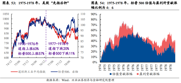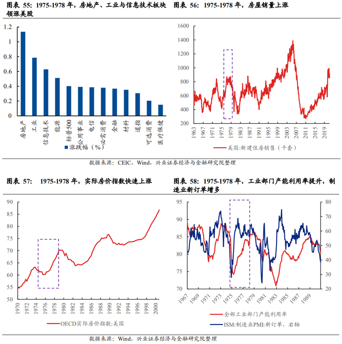 阶段4:1975-1978年,基本面复苏并维持繁荣,流动性先松后紧,美股“先扬后抑”,道指与标普500累计上涨30%和40%;房地产、工业与信息技术业领涨。