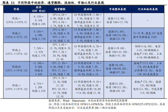 具体来看,根据市场周期和经济周期,我们可以将70年代一波三折的美股划分为五个阶段: