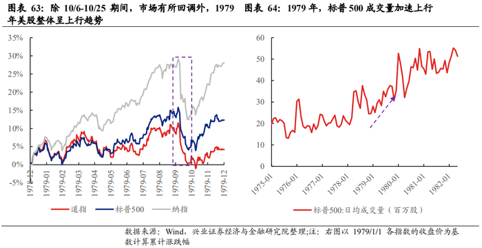 1979年,尽管分子端基本面衰退,叠加分母端无风险利率走高,但市场却走出一轮小牛市,道指、标普500及纳指全年涨幅为4.2%、12.3%、28.1%。从驱动力来看,根据DDM模型,当盈利与估值同时向下的时候,美股上涨的动力只有可能来自市场风险偏好和情绪的提升,事实上我们也能看到1979年标普500成交量加速上行。我们认为沃克尔上台前,10年期国债收益率表征的流动性未边际降低对市场来说就是好消息;沃克尔10月6号发言后,鹰派货币政策短暂地使估值和美股回调,但之后不久,出于对美联储新任主席能够抑制长达10年的通货膨胀的信心,市场风险偏好再次回升。