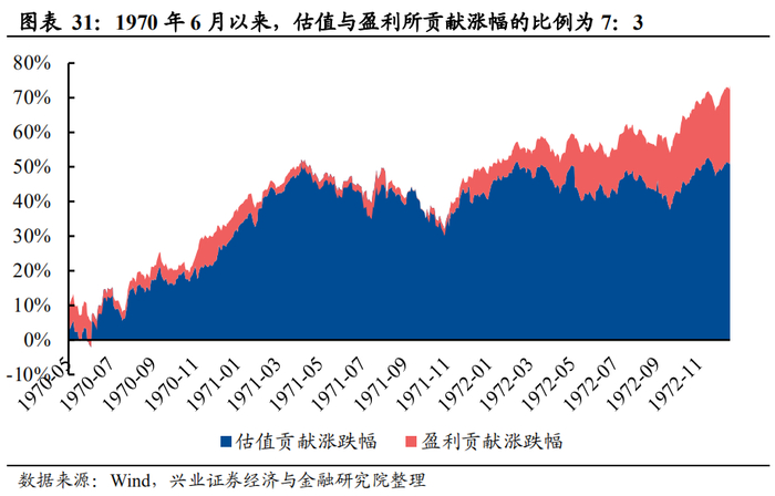 经济和盈利基本面显著回升,流动性充裕,叠加纳斯达克市场创立提振市场情绪,美股实现超跌反弹并开启两年半的回升行情,截至1972年年底,道指与标普500涨幅分别为61.6%、70.4%。从驱动力来看,标普500估值与盈利所贡献涨幅的比例为7:3。