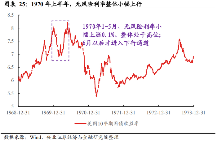 流动性:持续的高通胀使市场对美联储的宽松政策“不买账”,无风险利率持续处于高位。实际上,1970年2月1日,伯南克就任之后就将货币政策的目标函数由“抗通胀”转为“抗衰退”,有效联邦基金利率呈下降趋势,但10年期国债利率仅在2月有短暂的降低,之后,由于CPI同比仍处于6%左右的高位,市场的通胀预期使10年期国债利率再次上涨。拉长来看,截至5月23日,无风险利率由7.9%小幅上涨至8%,也就是说美联储所释放的流动性并未使市场利率接受,该时期无风险利率更多地是受通胀预期干扰。所以我们可以看到,当1970年6月随着CPI同比确认向下的拐点后,10年期国债收益率才进入下行通道。