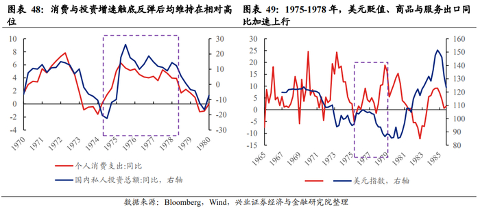 基本面:石油危机结束后,强劲的企业投资和居民消费,叠加美元贬值带动的出口,三架马车共同支撑美国经济触底回升后维持高速增长。投资方面,随着流动性边际增加,尤其是美联储多次调整商业银行最优惠贷款利率,融资成本降低催化投资走高,美国私人投资总额增速由-23.4%回升至26.3%,此后持续保持在10%以上的高位,其对GDP同比增长的拉动平均在1.2%左右;消费方面,受《1975年减税法案》刺激,叠加通胀向下、收入向上,消费最先开始复苏,美国个人消费支出同比快速反弹并整体维持在4%以上的高位,其对GDP同比增长的拉动平均在2.5%左右;出口方面,受益于全球需求复苏(OECD:G7的工业生产指数由50升至60)以及美元贬值(美元指数由97.3降至86.5),美国出口金额增速由3.1%升至18.8%。