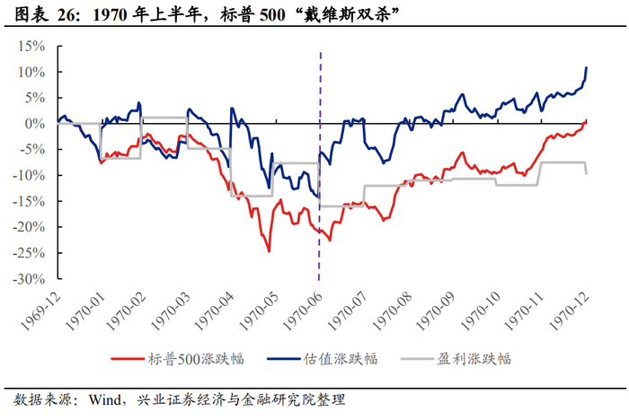1970年上半年,经济陷入衰退,叠加无风险利率持续处于高位,市场延续了1969年的颓势,截至1970年5月底,道指与标普500的跌幅均在20%以上。从驱动力来看,该阶段美股“戴维斯双杀”,标普500估值下跌12.5%,拖累指数下行11.6%,盈利减少14%,拖累指数下行13.1%。