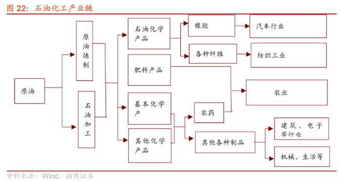 根据工业生产流程,原油产业链一般包括:原油开采—炼油—化学工业—纺织、机械行业。原油价格随着产业链逐渐传导,同时从上游到下游随着行业集中度的降低,价格传导作用逐渐减弱。