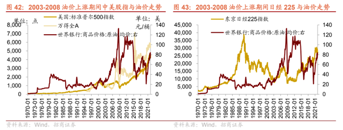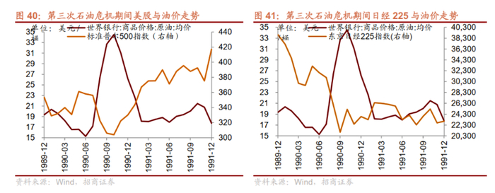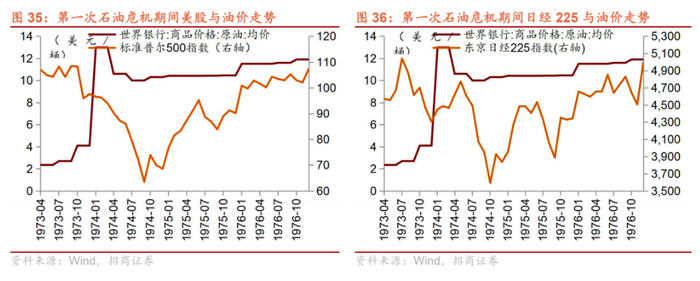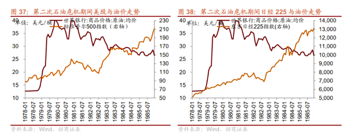 2、股指层面。对应到相应期间的股指变动:第一次石油危机期间,以OPEC的两次提价为界限,标普500和日经225均有两轮的大幅下跌。