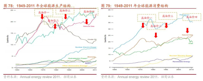 3、能源结构:几次高油价使得原油在全球能源消费生产中占比逐渐降低,天然气、煤炭、核能等占比逐渐提升。