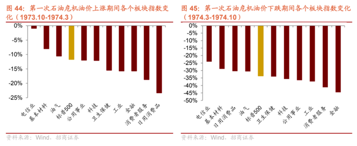 第一次石油危机油价上行期间(1973年10月至1974年3月),标普500指数下跌11.72%,电信行业指数跌幅最小为0.93%,基本材料行业跌8.02%,油气行业跌10.58%,其余行业跌幅均超过标普500。