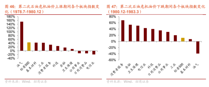 第二次石油危机油价上涨期间(1978年7月至1980年12月),基本材料、工业等行业指数有所上涨,油价下跌期间,金融行业、卫生保健行业和电信有较大幅度的上涨。