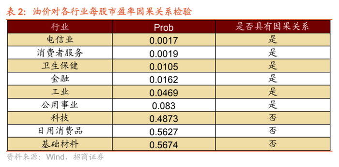 3、各个板块表现。该报告选取三次石油危机期间(1973年1月至1991年12月)世界原油均价与各个一级行业每股市盈率的月度数据,取对数,差分调整之后,得到如下因果检验结果。