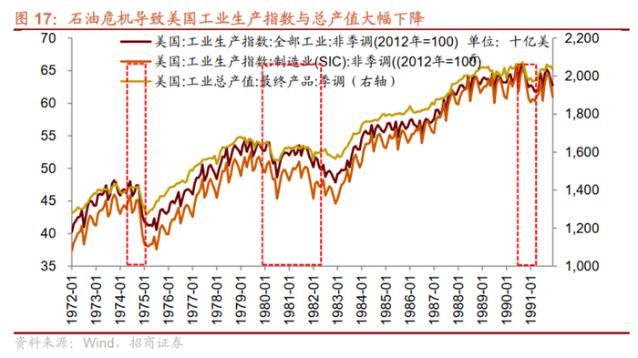 在前述三次石油危机期间,美国工业总产值均出现下滑。其中,第一次石油危机期间下滑程度最大,工业总产值从1973年10月的1.46万亿美元降到1975年6月的1.31万亿美元,降幅达8%。
