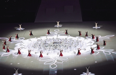 随着“雪花凳”的移动,90位“雪花姑娘”在柔美的音乐里翩翩起舞……开幕式上,百余名演员合作完成了当天唯一的文艺表演节目《冬残奥圆舞曲》。