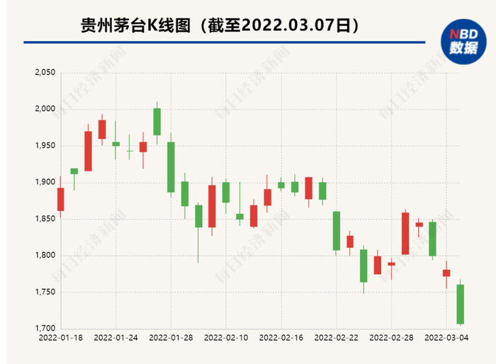 在股价连续下挫已逼近1700元/股关口背景下,3月7日晚间,贵州茅台(600519.SH)罕见地披露了2022年1~2月的主要经营数据。据媒体统计,这是贵州茅台历史上首次发布此类数据。