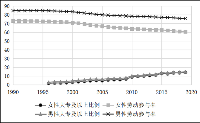 图4 1990-2019分性别大专及以上学历人口比例和劳动参与率(%)数据来源:国家统计局、世界银行。