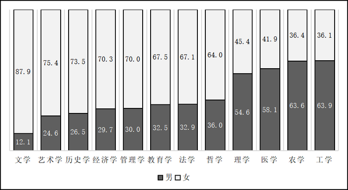受“理工男、文科女”传统观念影响,女性在进行专业选择时难以跨越性别界限,这也是导致女大学生就业难的重要原因。在专业选择时,女生选择文学、艺术学、历史学等较多;而在工学、农学、医学、理学等对逻辑推理、数学能力、实验观察要求较高的学科中女性占比明显偏低(见图2)。