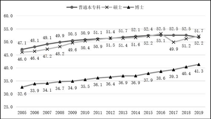 图1 2005-2019年全国高等教育各层次女性比例 (单位:%) 数据来源:教育部统计数据。