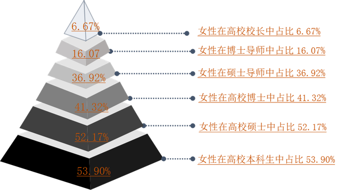 注:图片为笔者自制;大学校长女性占比根据教育部2021年2月数据计算,统计范围为教育部直属高校;其余各层次女性占比均由2019年教育部统计数据计算得出。
