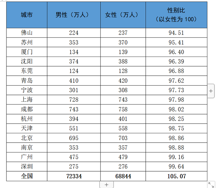 全国第七次人口普查数据显示,中国总人口“男多女少”,但北京、上海、天津、深圳等15座大城市的户籍人口已逆转为“女多男少”(见表1),其中高学历女性偏好向经济发达的大城市流动是推动这些地区出现性别比例逆转的重要原因。
