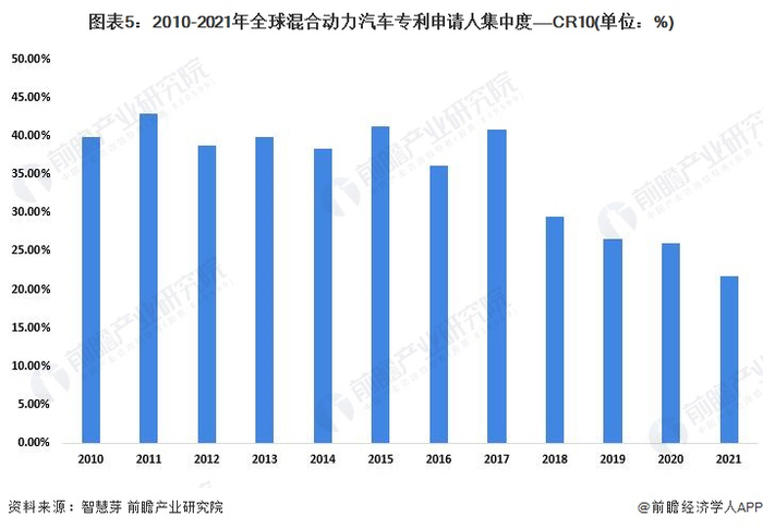 2010-2021年,全球混合动力汽车专利申请人CR10呈现波动下降趋势, 2021年下降至21.74%。整体来看,全球混合动力汽车专利申请人集中度不高。