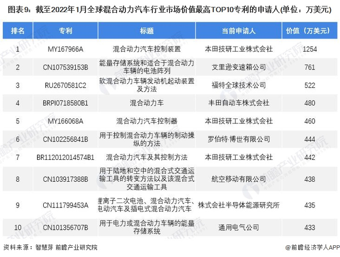 全球混合动力汽车市场价值最高TOP10专利中,有3项专利申请人都为本田技研工业株式会社,其中本田技研工业株式会社专利号为MY167966A的专利价值最高,为1254万美元。