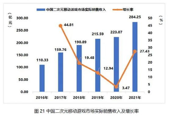 光看统计数据,2021年的二次元品类表现并不差。根据伽马数据《2021中国游戏产业报告》数据显示,在2021年我国二次元手游市场收入达到284.25亿元,同比增长27.43%,远高于6.4%的大盘增长率。但这个漂亮的数据是由《原神》一家独大支撑起来的。