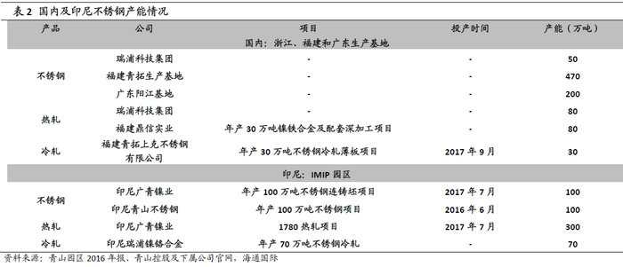 根据公司官网,青山控股于2008年3月建立了世界第一条RKEF-AOD不锈钢一体化生产线,此后开始在国内布局不锈钢生产基地。目前青山控股在国内拥有浙江、福建、广东三大生产基地,主要生产不锈钢粗钢、热轧、冷轧等。