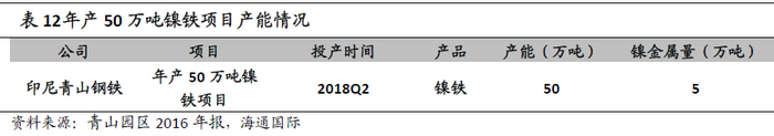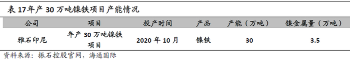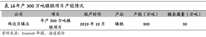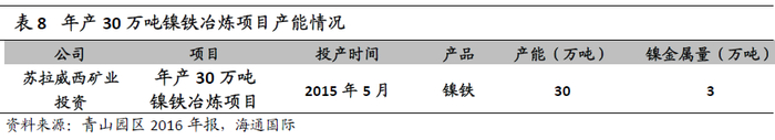 TSI项目年产镍铁50万吨,总投资约1.19亿美元,于2016年12月开工建设,2018年二季度投产。