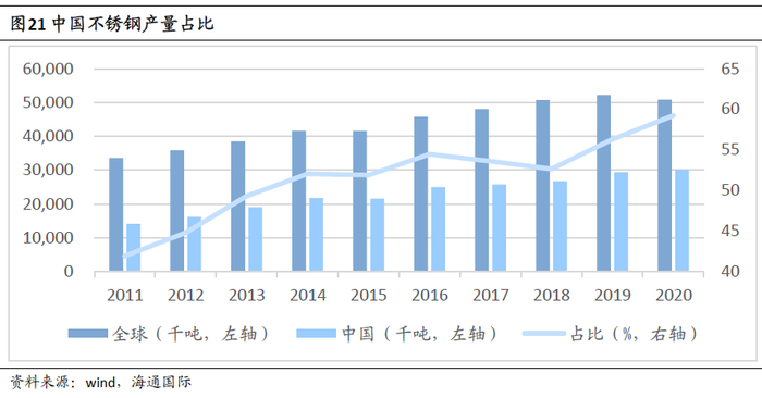 青山控股不锈钢市占率超1/3。根据Wind统计数据,全球不锈钢粗钢产量在2020年有所下滑,但总体保持上升态势。2020年全国不锈钢粗钢总产量为3013.9万吨,同比增长2.51%,占比近全球60%。其中青山控股不锈钢粗钢产量达1080万吨,约占中国市场供应量的35.8%。