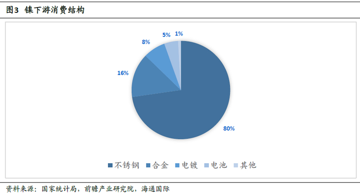 镍矿需求预计将保持增长。目前镍的消费结构中,不锈钢是镍的最大消费领域,占比达80%,电池占比5%,其他行业用镍占比15%。在三元电池正极材料领域中,由于高镍材料能量密度较高,且相较于钴的价格较低,具有广阔的市场前景。随着新能源汽车产业的高速增长,有望明显促进高镍三元材料对镍资源的需求。