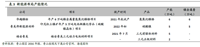 鉴于新能源汽车产业正在高速增长,青山集团依托于丰富的上游资源优势,于2017年开始布局新能源行业,并从上游镍矿开采和下游新能源产品制造两方面,力图打造“镍钴矿产资源开采-湿法冶炼-前驱体-正极材料-电池应用”新能源全产业链。目前公司已经携手华友钴业和格林美,在印尼开发红土镍矿,用以建设新能源电池镍资源原料制造体系;携手徐工集团,入局新能源汽车行业。此外还与华友钴业、中伟股份签订高冰镍供应协议,约定青山实业将于2021年10月开始一年内向华友钴业供应6万吨高冰镍,向中伟股份供应4万吨高冰镍。