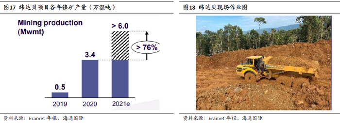 纬达贝项目镍矿寿命预计长达 50 年,于2019年10月开始运营。纬达贝镍业一期工程于2020年5月全面投产,于2020年生产了340万湿吨的镍矿石,其中青山集团权益产量为190万湿吨。根据生产指引,2021年该项目计划生产超过600万湿吨镍矿石。