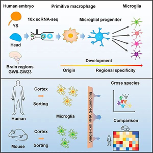 近年来,快速发展的单细胞组学技术,为理解细胞命运决定和细胞异质性提供了强有力的工具。之前对小鼠的单细胞测序研究结果显示,小胶质细胞具有高度异质性。然而,人类和小鼠之间的物种差异极大地限制了我们对人类小胶质细胞分化和发育功能的理解,尤其是在早期胚胎发育期间。此外,迄今为止,人类单细胞测序研究仅研究了小胶质细胞的早期起源,从卵黄囊到大脑进入前,或整个CNS中小胶质细胞的发育,对于人脑早期发育过程中小胶质细胞的区域特化命运决定和状态转换并不清楚。