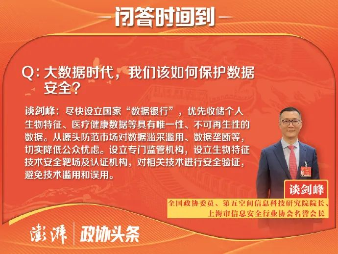 近年来,从指纹解锁到人脸识别,基于个人生物特征信息的身份识别被广泛应用,然而目前生物识别技术主要被企业掌握,潜在风险不言而喻。对此,谈剑锋在今年全国两会提案中建议:尽快设立国家“数据银行”,由国家成立专门机构统一管控,以最大程度地保障关键数据安全和国家安全。