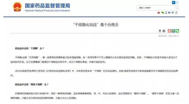 国家药品监督管理局在其官网发布科普文章《“干细胞化妆品”是个伪概念》