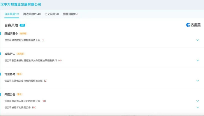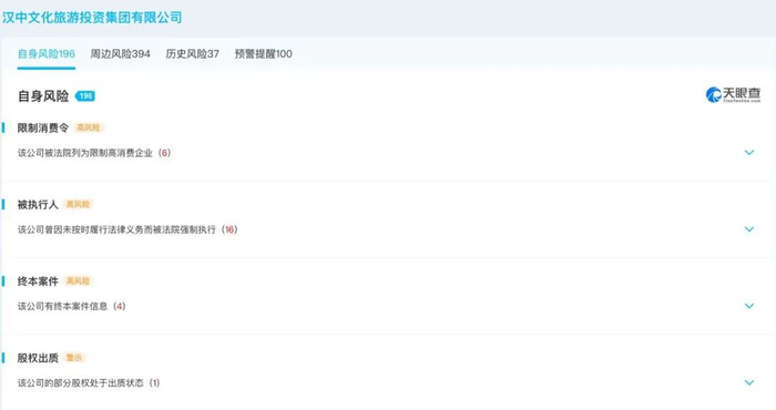 汉中文化法定代表人为杨海明,自2012年5月就任汉中兴元新区管理委员会副主任,亦是汉中文化大股东汉中万邦置业发展有限公司(持有79.81%,于2018年12月22日认缴出资)的董事长。汉中文化由汉台区财政局和汉中经济开发区财政局分别持有12.38%、4.13%股份,认缴日期2012-06-15。值得注意的是,汉中市城市建设投资开发有限公司持有汉中文化3.68%股份,认缴日期2016-07-22。万邦置业亦是官司缠身,自身风险达120条,周边风险2529条,历史风20条预警提醒150条,因未按时履行法律义务而被法院强制执行4次,总金额达5亿元。