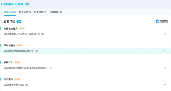 然而,现实超出了大多数旅游人的预料,时至今日就连跨省游都未重启,更遑论出境游,未来尚不可知。据知情人士透露,目前皇包车团队的大部分都已解散,部分在做免税购物。数据显示,皇包车运营实体北京纯粹旅行有限公司官司缠身,自身风险达92条,周边风险76条,历史风险29条,预警提醒154条;该公司因为劳动仲裁案子被法院强制执行十余次,立案集中于2021年底2022年初,标的金额多在10万元以内,被最高人民法院公示为失信公司和限制高消费企业,可见其现金流之紧张。