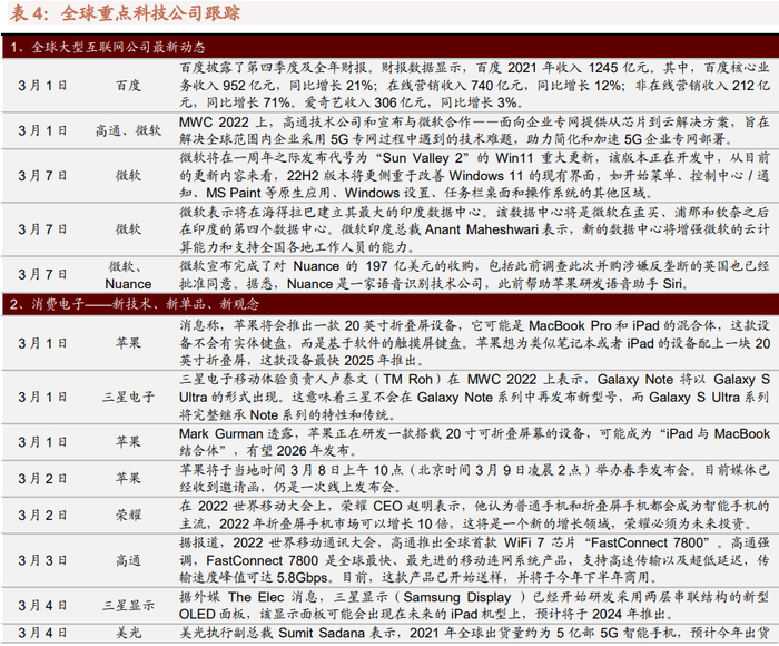 上周全球股市普跌。西方国家对俄罗斯制裁愈演愈烈,限制了俄罗斯能源及部分上游材料出口,导致大宗商品价格大幅上涨,引发全球对滞涨的担忧。产业趋势层面,TCL、OPPO、荣耀等手机厂商在MWC 2022上争先发布了折叠屏产品,预计2022年折叠屏手机渗透率将加速提升。俄乌局势的发展对我国具有重要启示,我国必须在金融、能源、资源、设备、材料的自主可控方面做好更多的准备和预案。