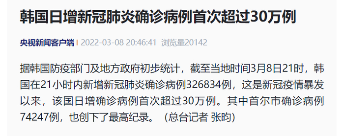 3月8日最新消息,据央视新闻报道,韩国防疫部门及地方政府初步统计,截至当地时间3月8日21时,韩国在21小时内新增新冠肺炎确诊病例326834例,这是新冠疫情暴发以来,该国日增确诊病例首次超过30万例。其中首尔市确诊病例74247例,也创下了最高纪录。