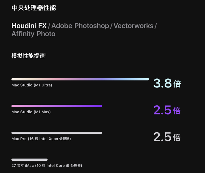 与搭载 28 核处理器的 Mac Pro 相比,中央处理器速度提升最高可达 60% 之多。