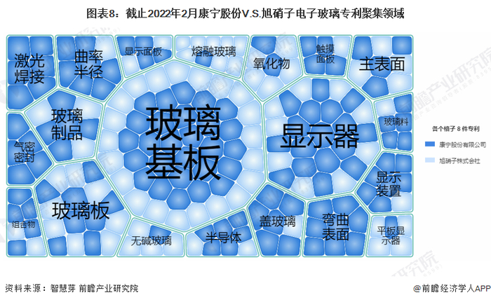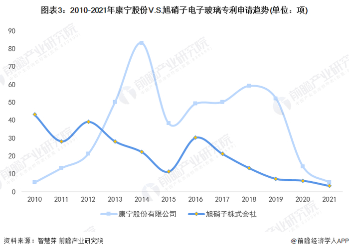 从趋势上看,2010-2021年康宁股份和旭硝子的专利申请数量呈现出波动变化趋势。但总体来说,2014年后,康宁股份的专利申请数量每年均高于旭硝子。2020年,康宁股份电子玻璃专利申请量较旭硝子高出8项。