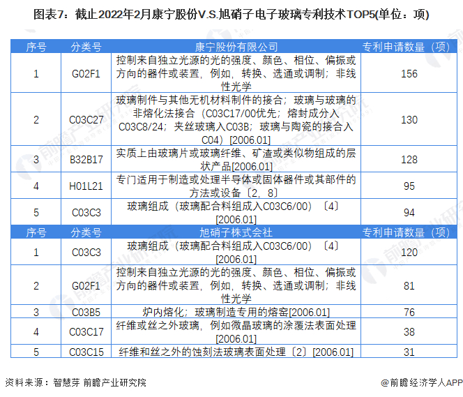 目前,“G02F1控制来自独立光源的光的强度、颜色、相位、偏振或方向的器件或装置,例如,转换、选通或调制;非线性光学”为康宁股份的重点布局领域,专利申请数量为156项。旭硝子的重点布局领域为“C03C3 玻璃组成(玻璃配合料组成入C03C6/00)〔4〕[2006.01]”,专利申请数量为120项。双方的专利布局前五位差异化较大。重点细分电子玻璃技术布局情况如下: