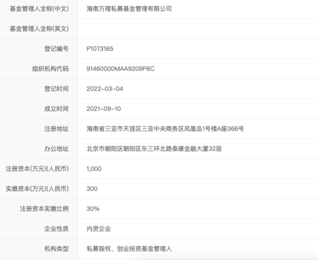 3月4日,一家名为“海南万理私募基金管理有限公司”(以下简称海南万理私募)的私募完成备案,其法定代表人、总经理和实控人正是原红杉中国合伙人曹曦;这家机构的另一位合伙人则是曾在博裕资本担任合伙人的王宇晨,可谓是两位行业大佬的联手。