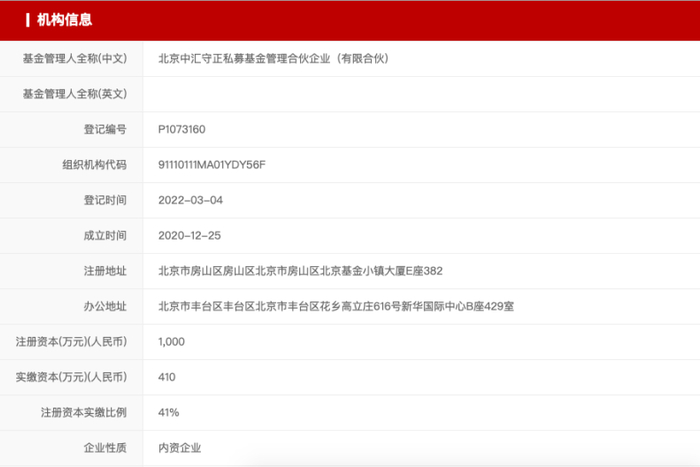 首先来看看中汇守正私募。中基协备案信息显示,这家机构成立于2020年底,注册资本1000万元。其执行事务合伙人(委派代表)、董事总经理王李允泰有8年的证券从业经验,在中邮基金工作多年,并且一度担任专户部副总经理。