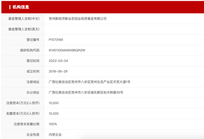 另一家成立于2018年的私募基金——贺州新经济新业态创业投资基金有限公司,3月4日也成功完成备案,注册资本1亿元。