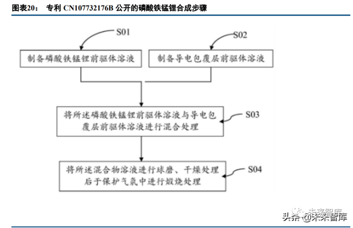 公开于 2018 年的专利 CN107732176B 介绍了一种纳米级锂离子电池正极材料的制备方法。该发明纳米级锂 离子电池正极材料制备方法包括的步骤有:制备磷酸铁锰锂前驱体溶液;制备导电包覆层前驱体溶液;将所述 磷酸铁锰锂前驱体溶液与导电包覆层前驱体溶液进行混合处理,形成混合物溶液;将所述混合物溶液进行球磨、 干燥处理后于保护气氛中进行煅烧处理。可以看出,混合前驱体溶液、球磨干燥并最终煅烧,该专利的过渡金 属元素均匀化环节主要通过液相法完成。
