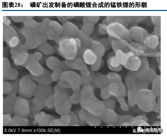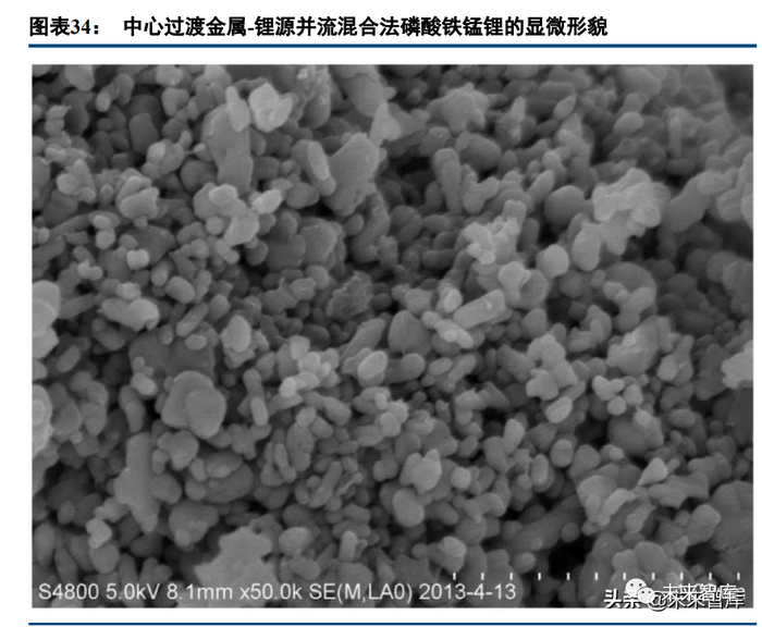 公开于 2013 年的专利 CN103280579A 描述了正极材料磷酸铁锰锂(掺杂微量镁)的制备方法,该方法主要 包括氧化铁原料细化和活化,将锂源、镁源、活化氧化铁原料、锰源、磷源、碳源按一定摩尔计量系数配比后 在有机溶剂体系下研磨细化制备前驱体,预烧,粗粉碎,烧结。该材料 0.1C 倍率首放容量超过 150mAh/g, 0.2C 倍率放电容量大于 140mAh/g。无分辨率较高的形貌图片给出。